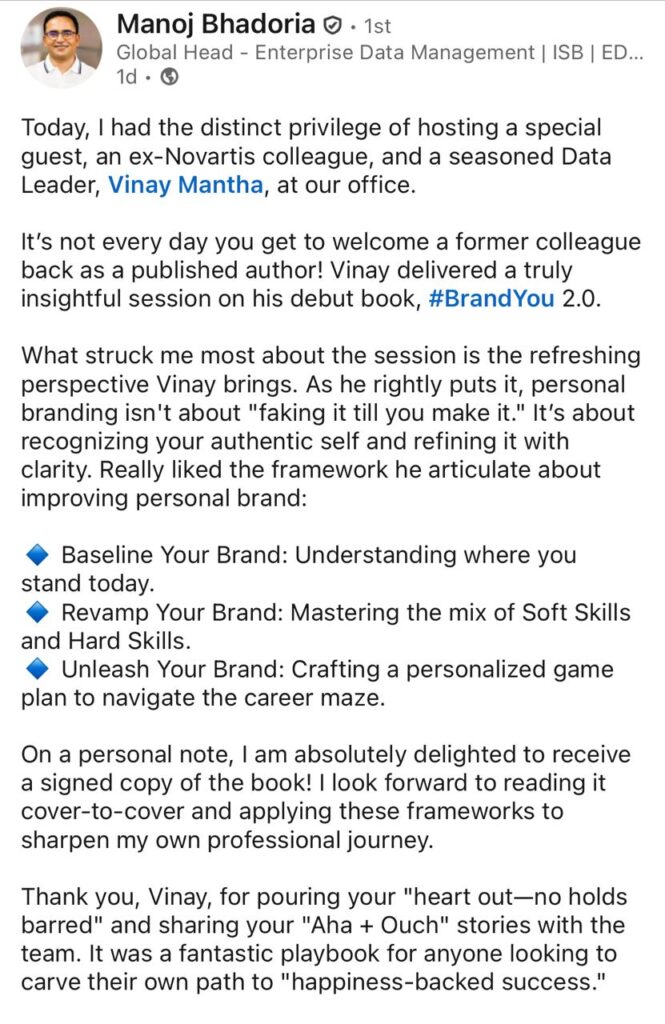With over two decades of experience across industries and continents, Vinay has worn many hats — programmer, strategist, architect, advisor, and growth enabler. But at heart, he has always been a mentor. His debut book, #BrandYOU 2.0, is more than a guide to personal branding; it’s a heartfelt reflection of his journey, his lessons, and his desire to light a spark in others.